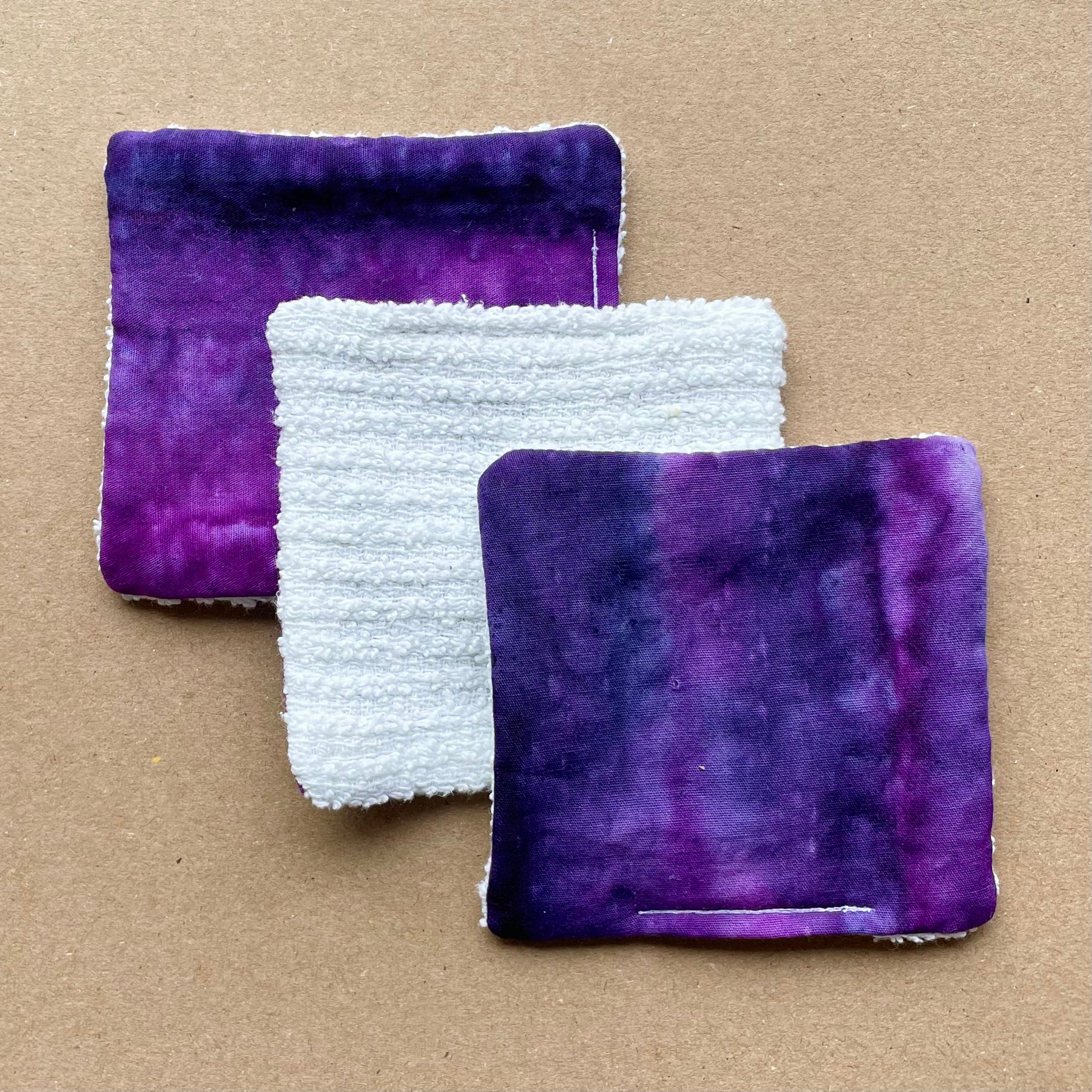 You will receive a matching set of three skincare scrubbies, each measuring approximately 8.5 x 8.5cm (3.25in) in size. Please note that the exact pattern placement and colours of the scrubbies you receive may differ slightly from those photographed. Not intended for use with highly-pigmented or waterproof cosmetics. For optimal product care, wash in a net laundry bag.Â